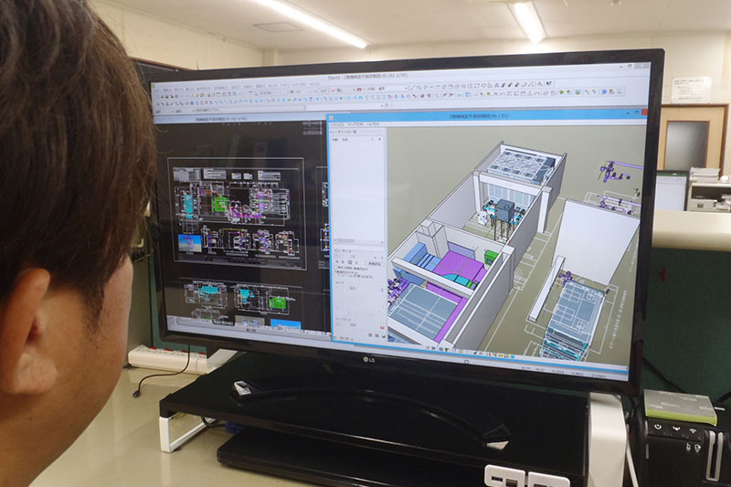 設備図面は3D CADを使用して設計をしています。最新のグラフィック技術により、3D表示させ部材や機器との干渉検査や複雑な取り回しなど顧客との合意形成の場面では特に役立っています。業務のパフォーマンスを高め、設備図面作成に関連する業務をしっかりとサポートしています。